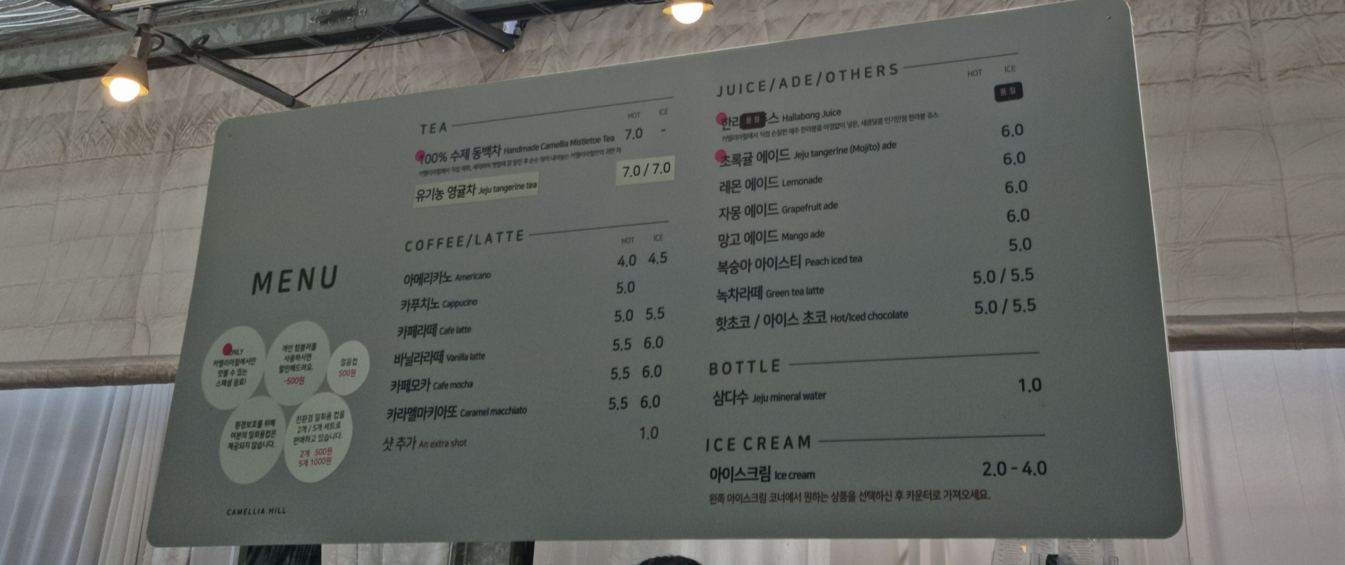 카멜리아힐 플라워카페의 메뉴판▲ (2022.04 기준)