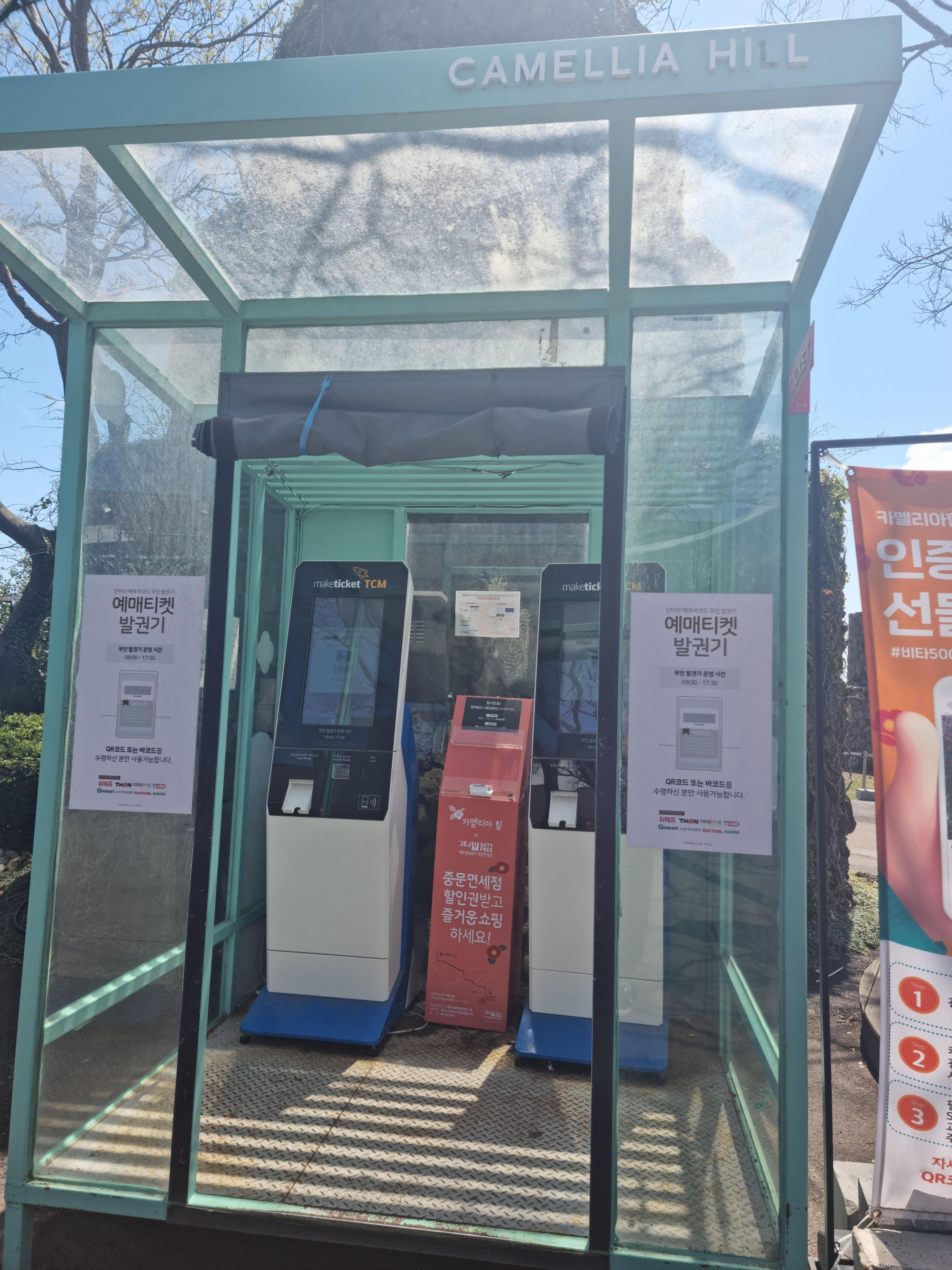 카멜리아힐에는 온라인으로 구매한 티켓을 뽑을 수 있는 티켓부스가 따로 마련되어 있다. 사전에 온라인으로 예매를 했다면 매표소 맞은편, 입구 바로 앞에 있는 티켓부스의 키오스크를 이용하면 된다.